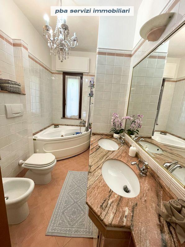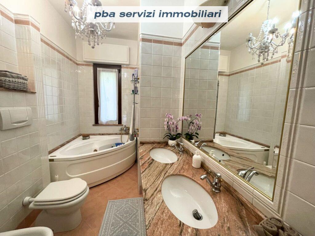 Il secondo livello, raggiungibile tramite la scala interna, ospita invece tre camere da letto matrimoniali con accesso a graziosi terrazzini immersi nel verde, ed un secondo elegante bagno finestrato spazioso con doppio lavabo e vasca angolare con idromassaggio.